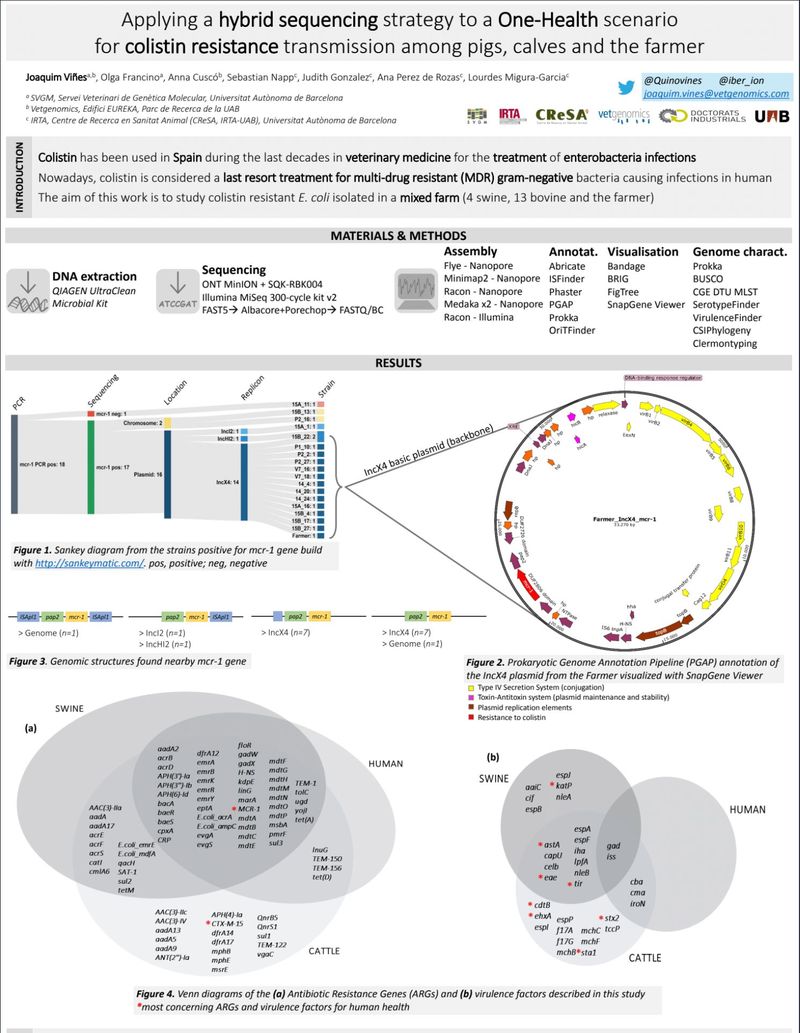 Colistin has been used in Spain during the last decades in veterinary medicine for the treatment of enterobacteria infections. Nowadays, colistin is considered a last resort treatment for multi-drug resistant (MDR) gram-negative bacteria causing infections in human. The aim of this work is to study colistin resistant E. coli isolated in a mixed farm (4 swine, 13 bovine and the farmer)