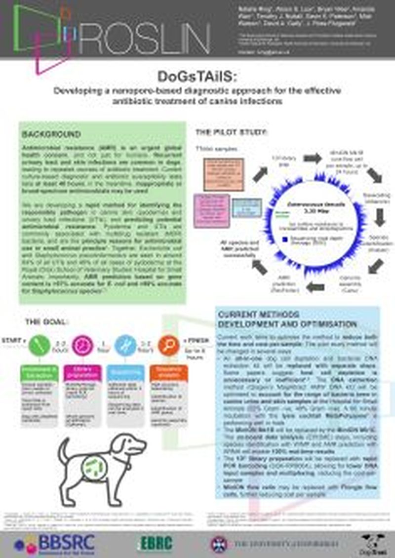Antimicrobial resistance (AMR) is an urgent global health concern, and not just for humans. Recurrent urinary tract and skin infections are common in dogs, leading to repeated courses of antibiotic treatment. Current culture-based diagnostic and antibiotic susceptibility tests take at least 48 hours; in the meantime, inappropriate or broad-spectrum antimicrobials may be used. We are developing a rapid method for identifying the responsible pathogen in canine skin (pyoderma) and urinary tract infections (UTIs), and predicting potential antimicrobial resistance. Pyoderma and UTIs are commonly associated with multidrug resistant (MDR) bacteria, and are the principle reasons for antimicrobial use in small animal practice1 . Together, Escherichia coli and Staphylococcus pseudintermedius are seen in around 64% of all UTIs and 46% of all cases of pydoderma at the Royal (Dick) School of Veterinary Studies’ Hospital for Small Animals. Importantly, AMR prediction based on gene content is >97% accurate for E. coli and >99% accurate for Staphylococcus species.