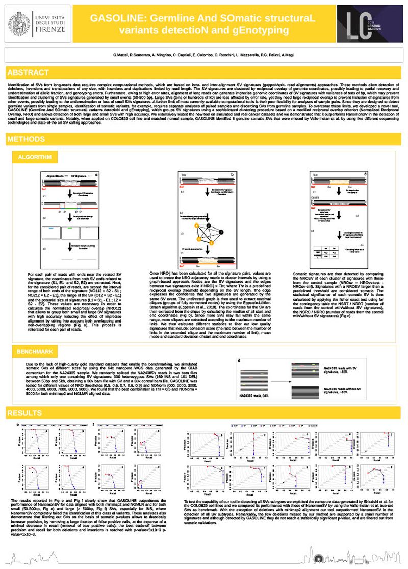 Identification of SVs from long-reads data requires complex computational methods, which are based on intra- and inter-alignment SV signatures (gapped/split- read alignments) approaches. These methods allow detection of deletions, inversions and translocations of any size, with insertions and duplications limited by read length. The SV signatures are clustered by reciprocal overlap of genomic coordinates, possibly leading to partial recovery and underestimation of allelic fraction, and genotyping errors. Furthermore, owing to high error rates, alignment of long reads can generate imprecise genomic coordinates of SV signatures with variances of tens of bp, which may prevent identification and clustering of SVs signatures generated by small events (50-500 bp). Large SVs (tens or hundreds of kb) are less affected by error rate, yet they need large reciprocal overlap to prevent inclusion of signatures from other events, possibly leading to the underestimation or loss of small SVs signatures. A further limit of most currently available computational tools is their poor flexibility for analyses of sample pairs. Since they are designed to detect germline variants from single samples, identification of somatic variants, for example, requires separate analyses of paired samples and discarding SVs from germline samples. To overcome these limits, we developed a novel tool, GASOLINE (Germline And SOmatic structuraL varIants detectioN and gEnotyping), which groups SV signatures using a sophisticated clustering procedure based on a modified reciprocal overlap criterion (Normalized Reciprocal Overlap, NRO) and allows detection of both large and small SVs with high accuracy. We extensively tested the new tool on simulated and real cancer datasets and we demonstrated that it outperforms NanomonSV in the detection of small and large somatic variants. Notably, when applied on COLO829 cell line and matched normal sample, GASOLINE identified 6 genuine somatic SVs that were missed by Valle-Inclan et al. by using five different sequencing technologies and state-of-the-art SV calling approaches.