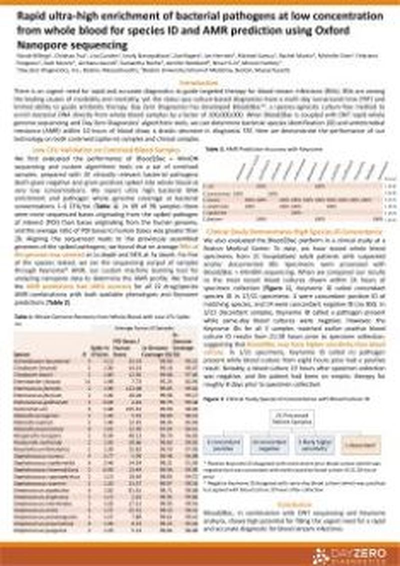 There is an urgent need for rapid and accurate diagnostics to guide targeted therapy for blood stream infections (BSIs). BSIs are among the leading causes of morbidity and mortality, yet the status quo culture-based diagnostics have a multi-day turnaround time (TAT) and limited ability to guide antibiotic therapy. Day Zero Diagnostics has developed Blood2Bac™, a species-agnostic culture-free method to enrich bacterial DNA directly from whole blood samples by a factor of 100,000,000. When Blood2Bac is coupled with ONT rapid whole genome sequencing and Day Zero Diagnostics’ algorithmic tools, we can determine bacterial species identification (ID) and antimicrobial resistance (AMR) within 10 hours of blood draw, a drastic decrease in diagnostic TAT. Here we demonstrate the performance of our technology on both contrived (spike-in) samples and clinical samples.