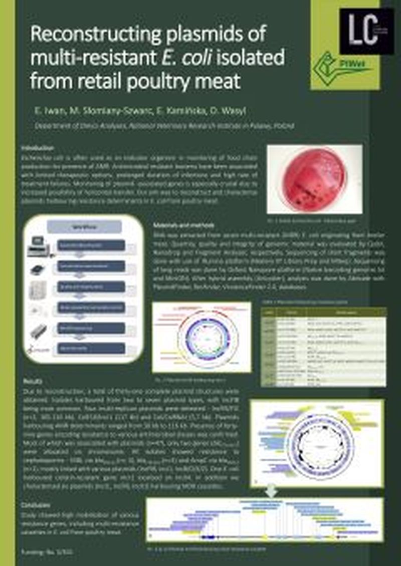 Escherichia coli is often used as an indicator organism in monitoring of food chain production for presence of AMR. Antimicrobial resistant bacteria have been associated with limited therapeutic options, prolonged duration of infections and high rate of treatment failures. Monitoring of plasmid-associated genes is especially crucial due to increased possibility of horizontal transfer. Our aim was to reconstruct and characterise plasmids harbouring resistance determinants in E. coli from poultry meat