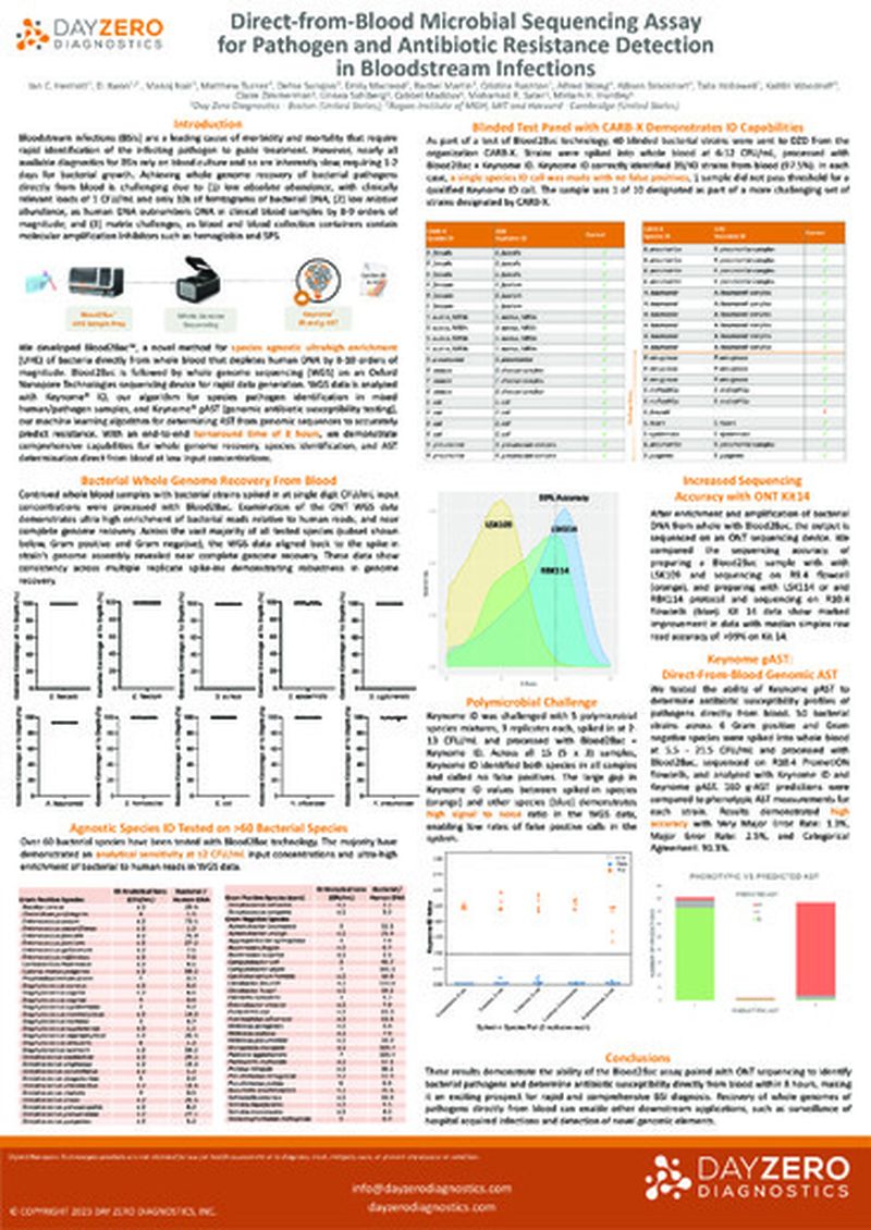 Bloodstream infections (BSIs) are a leading cause of morbidity and mortality that require rapid identification of the infecting pathogen to guide treatment. However, nearly all available diagnostics for BSIs rely on blood culture and so are inherently slow, requiring 1-2 days for bacterial growth. Achieving whole genome recovery of bacterial pathogens directly from blood is challenging due to (1) low absolute abundance, with clinically relevant loads of 1 CFU/mL and only 10s of femtograms of bacterial DNA; (2) low relative abundance, as human DNA outnumbers DNA in clinical blood samples by 8-9 orders of magnitude; and (3) matrix challenges, as blood and blood collection containers contain molecular amplification inhibitors such as hemoglobin and SPS. We developed Blood2Bac™ , a novel method for species agnostic ultrahigh enrichment (UHE) of bacteria directly from whole blood that depletes human DNA by 8-10 orders of magnitude. Blood2Bac is followed by whole genome sequencing (WGS) on an Oxford Nanopore Technologies sequencing device for rapid data generation. WGS data is analyzed with Keynome® ID, our algorithm for species pathogen identification in mixed human/pathogen samples, and Keynome® gAST (genomic antibiotic susceptibility testing), our machine learning algorithm for determining AST from genomic sequences to accurately predict resistance. With an end-to-end turnaround time of 8 hours, we demonstrate comprehensive capabilities for whole genome recovery, species identification, and AST determination direct from blood at low input concentrations.