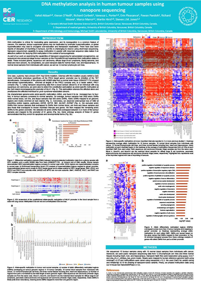 DNA methylation is critical for modulating gene expression, and its dysregulation is a common feature of cancers. For example, tumour suppressor genes may be inactivated by promoter hypermethylation, or global hypomethylation may lead to oncogene over-activation and transposon reactivation. There have also been reports of disruption of imprinting in tumours, but this is challenging to resolve using short-read sequencing. Nanopore sequencing’s capability to assay methylation in parallel with long-read sequence data makes it an attractive platform for studying DNA methylation in the context of tumourogenesis. As part of our work on examining the capabilities of Nanopore sequencing for personalized oncogenomics. We sequenced nine advanced-stage tumour samples on the PromethION and examined their methylation status in detail. These included glioma, squamous cell carcinoma, diffuse large B-cell lymphoma, Ewing sarcoma, and head and neck cancers. As comparators, we used nanopore data for normal heart, liver, and hippocampus, 16 normal blood samples from individuals with cancer, as well as 12 normal lymphocyte cell lines.