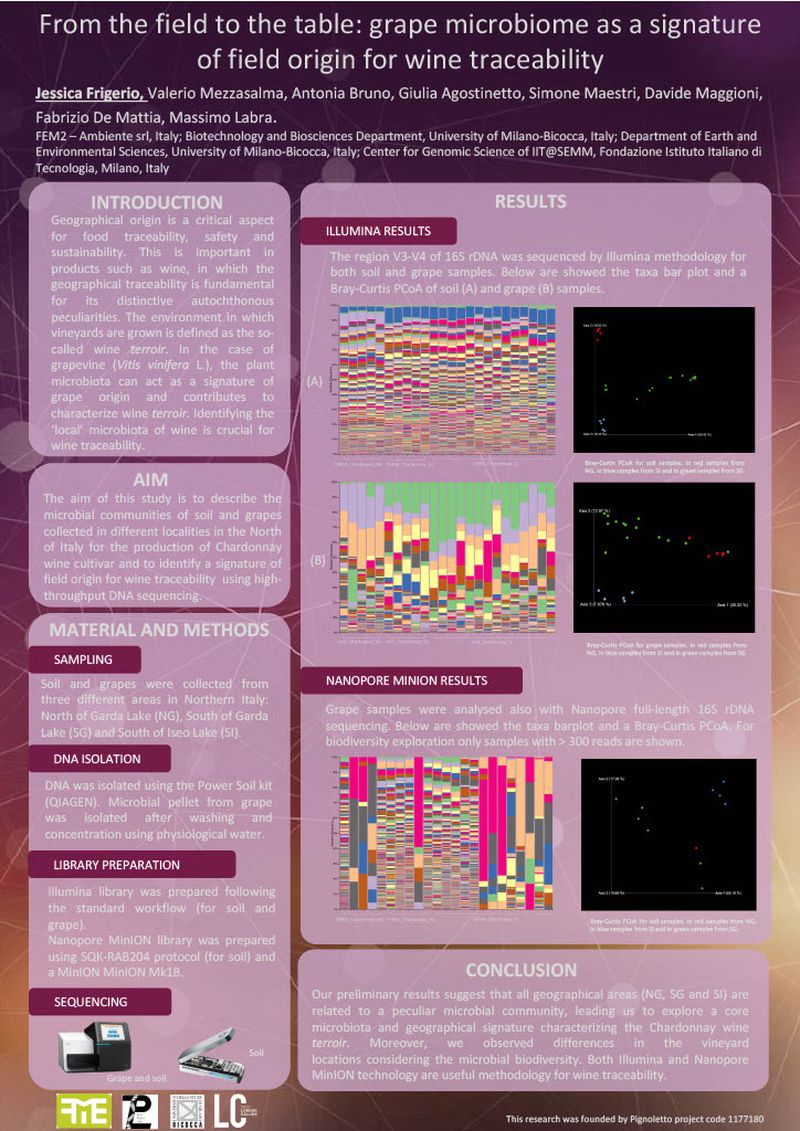 Geographical origin is a critical aspect for food traceability, safety and sustainability. This is important in products such as wine, in which the geographical traceability is fundamental for its distinctive autochthonous peculiarities. The environment in which vineyards are grown is defined as the so called wine terroir. In the case of grapevine (Vitis vinifera L.), the plant microbiota can act as a signature of grape origin and contributes to characterise wine terroir. Identifying the ‘local’ microbiota of wine is crucial for wine traceability.