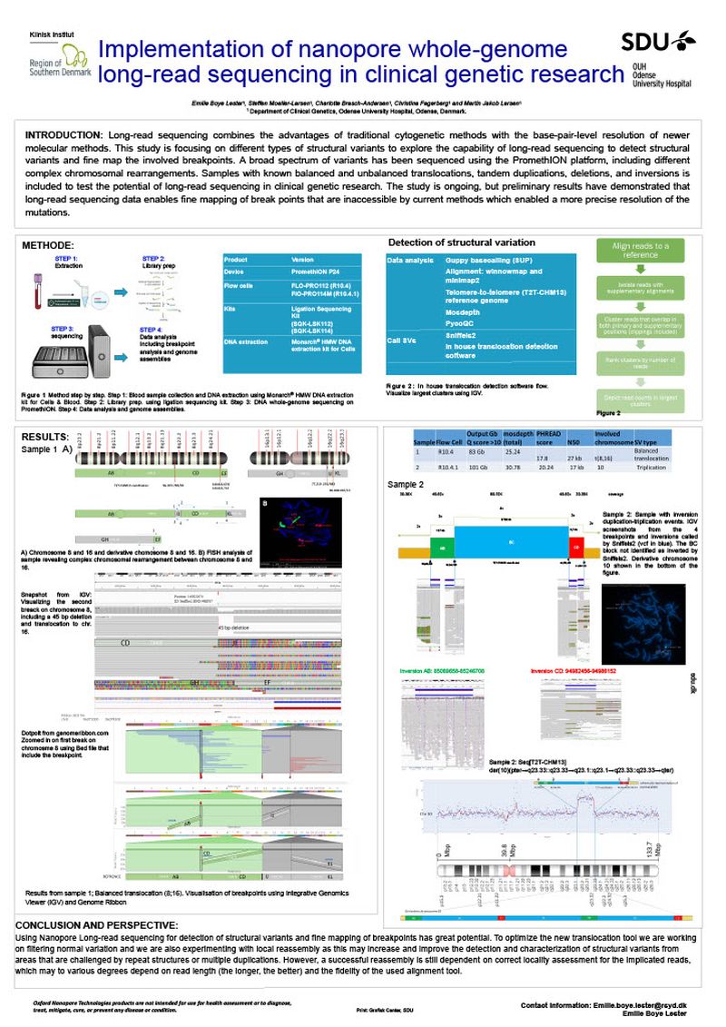 Long-read sequencing combines the advantages of traditional cytogenetic methods with the base-pair-level resolution of newer molecular methods. This study is focusing on different types of structural variants to explore the capability of long-read sequencing to detect structural variants and fine map the involved breakpoints. A broad spectrum of variants has been sequenced using the PromethION platform, including different complex chromosomal rearrangements. Samples with known balanced and unbalanced translocations, tandem duplications, deletions, and inversions is included to test the potential of long-read sequencing in clinical genetic research. The study is ongoing, but preliminary results have demonstrated that long-read sequencing data enables fine mapping of break points that are inaccessible by current methods which enabled a more precise resolution of the mutations.