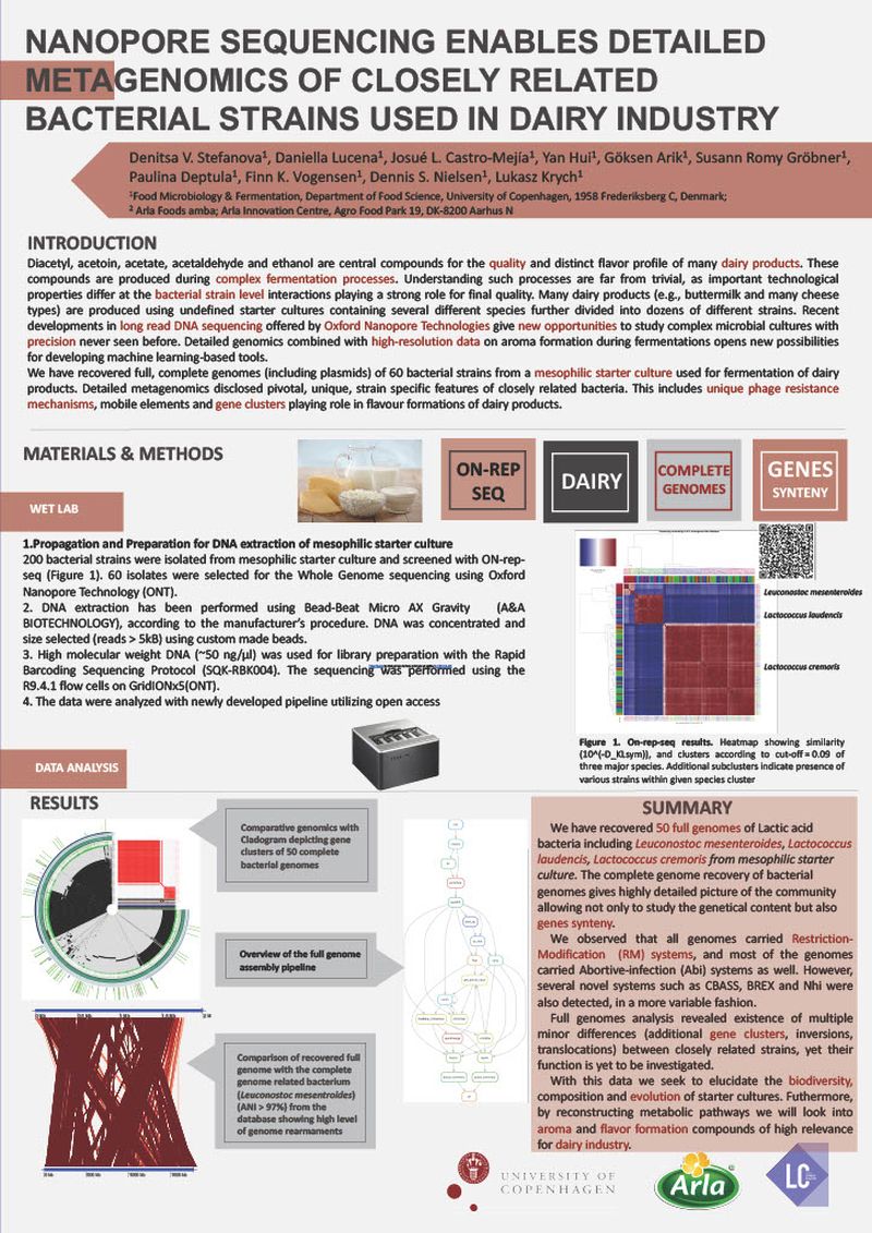 Diacetyl, acetoin, acetate, acetaldehyde and ethanol are central compounds for the quality and distinct flavor profile of many dairy products. These compounds are produced during complex fermentation processes. Understanding such processes are far from trivial, as important technological properties differ at the bacterial strain level interactions playing a strong role for final quality. Many dairy products (e.g., buttermilk and many cheese types) are produced using undefined starter cultures containing several different species further divided into dozens of different strains. Recent developments in long read DNA sequencing offered by Oxford Nanopore Technologies give new opportunities to study complex microbial cultures with precision never seen before. Detailed genomics combined with high-resolution data on aroma formation during fermentations opens new possibilities for developing machine learning-based tools.