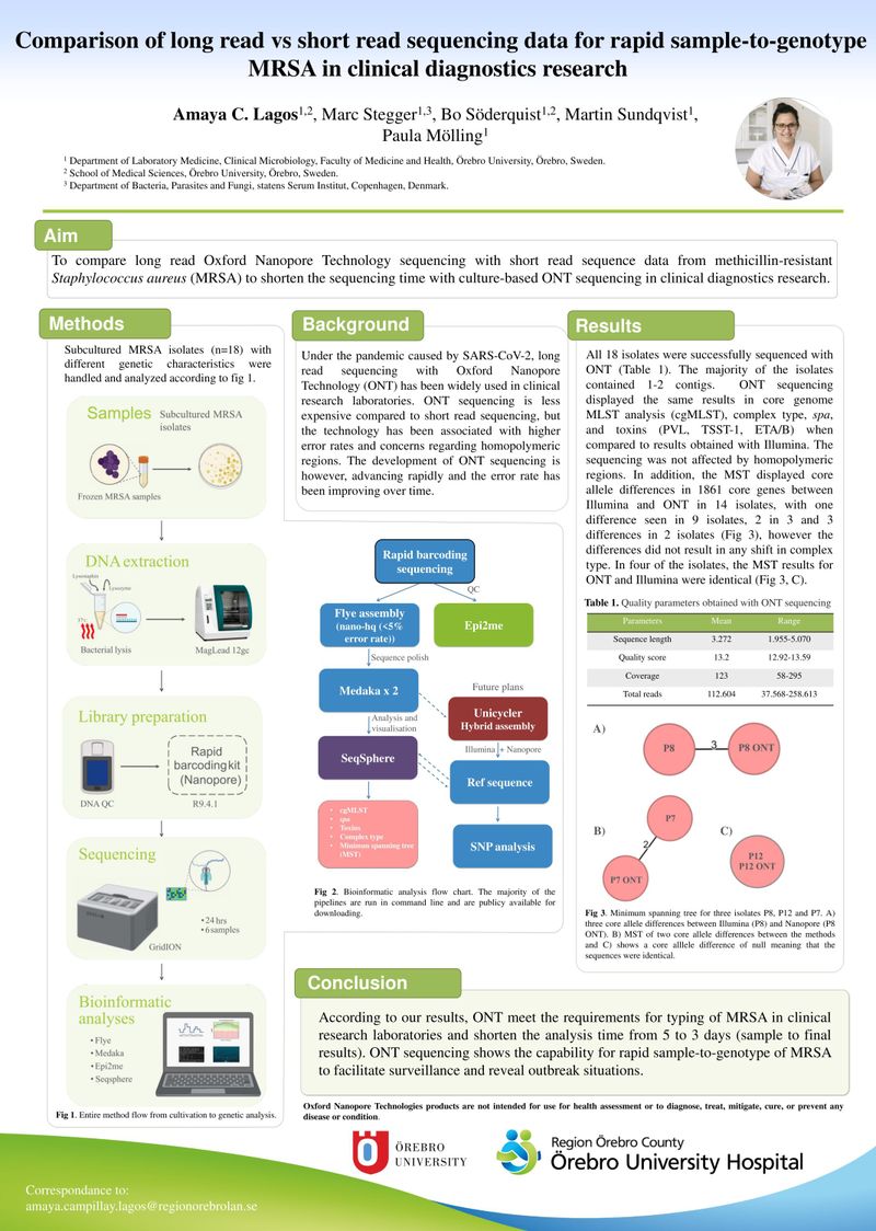 The aim of this poster is to compare long read Oxford Nanopore Technology sequencing with short read sequence data from methicillin-resistant Staphylococcus aureus (MRSA) to shorten the sequencing time with culture-based ONT sequencing in clinical diagnostics research.