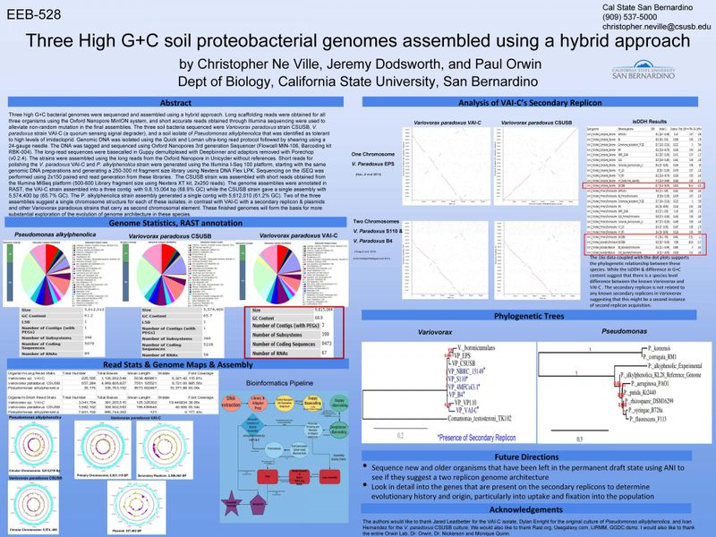 Three high G+C bacterial genomes were sequenced and assembled using a hybrid approach. Long scaffolding reads were obtained for all three organisms using the Oxford Nanopore MinION system, and short reads obtained through Illumina sequencing were used to alleviate non-random mutation in the final assemblies. The three soil bacteria sequenced were Variovorax paradoxus strain CSUSB, V. paradoxus strain VAI-C (a quorum sensing signal degrader), and a soil isolate of Pseudomonas alkylphenolica that was identified as tolerant to high levels of imidacloprid.