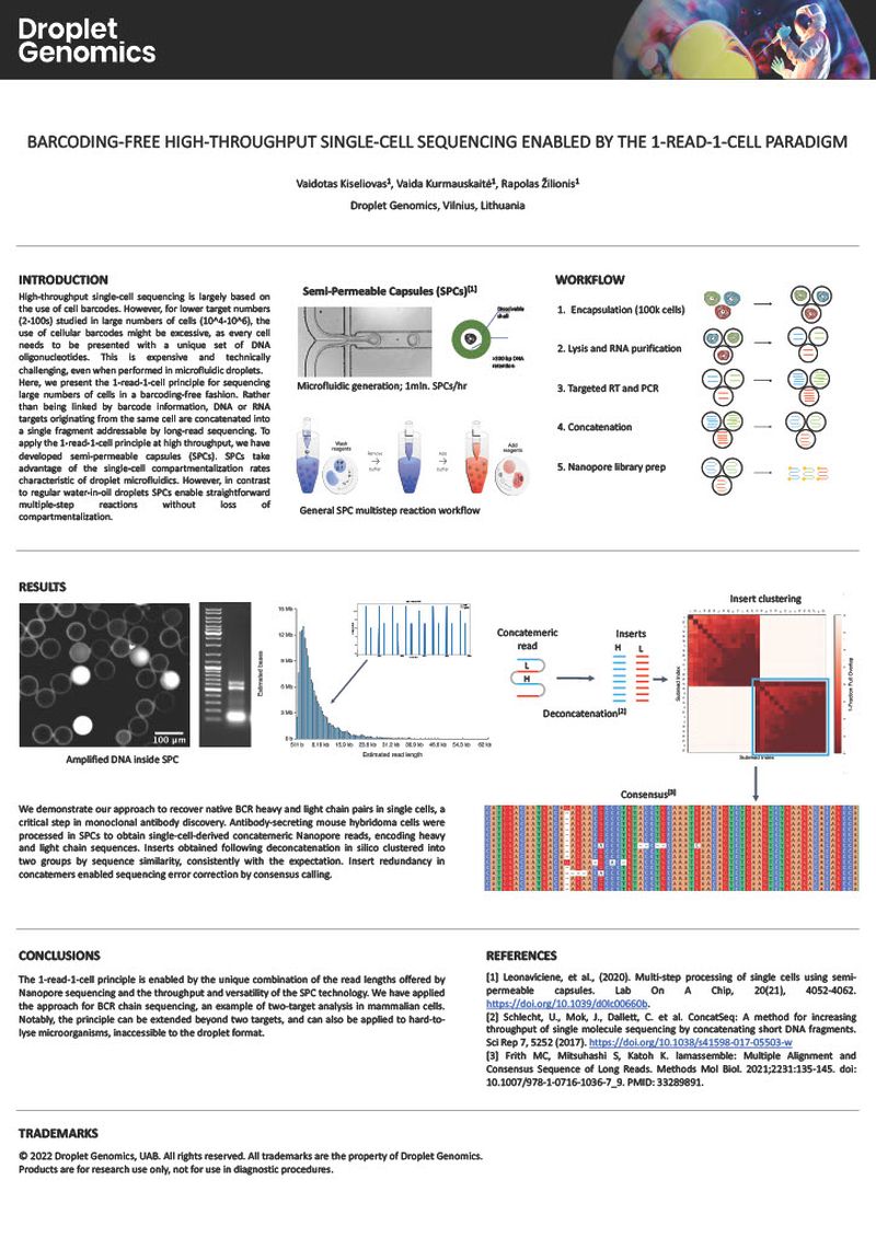 High-throughput single-cell sequencing is largely based on the use of cell barcodes. However, for lower target numbers (2-100s) studied in large numbers of cells (10^4-10^6), the use of cellular barcodes might be excessive, as every cell needs to be presented with a unique set of DNA oligonucleotides. This is expensive and technically challenging, even when performed in microfluidic droplets. Here, we present the 1-read-1-cell principle for sequencing large numbers of cells in a barcoding-free fashion. Rather than being linked by barcode information, DNA or RNA targets originating from the same cell are concatenated into a single fragment addressable by long-read sequencing. To apply the 1-read-1-cell principle at high throughput, we have developed semi-permeable capsules (SPCs). SPCs take advantage of the single-cell compartmentalisation rates characteristic of droplet microfluidics. However, in contrast to regular water-in-oil droplets SPCs enable straightforward multiple-step reactions without loss of compartmentalisation.