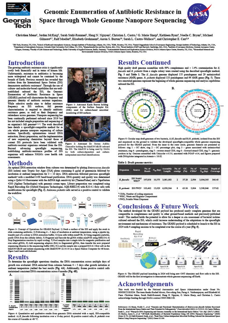 The growing antibiotic resistance crisis is significantly costly both financially and in terms of human life. Unfortunately, resistance to antibiotics is becoming more widespread and cannot be contained by the bounds of Earth. Previous research has revealed that isolates from the International Space Station (ISS) demonstrate antibiotic resistance1. Through the use of culture- and molecular-based capabilities that are well- established onboard the ISS, the Genomic Enumeration of Antibiotic Resistance in Space (GEARS) payload will characterize the frequency and genomic identity of antibiotic resistant organisms. While selective media aims to define resistance