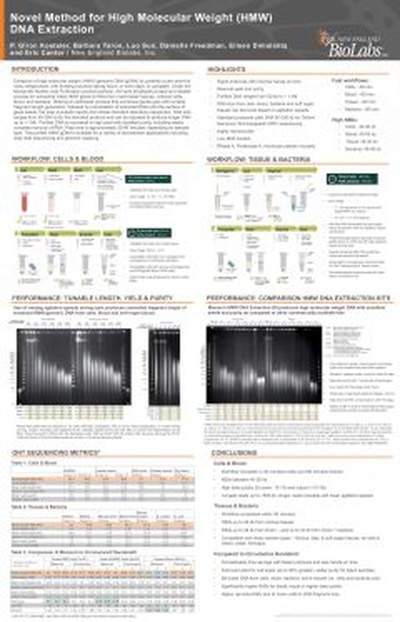 Extraction of high molecular weight (HMW) genomic DNA (gDNA) is currently a pain point for many researchers, with existing solutions taking hours, or even days, to complete. Under the Monarch® Nucleic Acid Purification product portfolio, we have developed a rapid and reliable process for extracting intact HMW genomic DNA from mammalian tissues, cultured cells, blood, and bacteria. Utilizing an optimized process that combines gentle lysis with tunable fragment length generation, followed by precipitation of extracted DNA onto the surface of glass beads, the prep proceeds rapidly and utilizes standard laboratory equipment. DNA size ranges from 50-250 kb for the standard protocol and can be adjusted to produce longer DNA up to >1 Mb. Purified DNA is recovered in high yield with excellent purity, including nearly complete removal of RNA. Prep time is approximately 30-90 minutes, depending on sample type. The purified HMW gDNA is suitable for a variety of downstream applications including long-read sequencing and genome mapping.