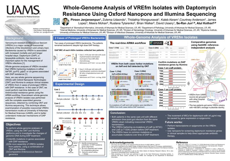 Here, we use whole genome sequencing (WGS) with Oxford Nanopore Technologies (ONT) and Illumina to analyze clinical isolates of VREfm from 2 cases of prolonged VREfm with DAP resistance. In the case of ONT, we could perform real-time detection of Antimicrobial resistance genes using the ARMA workflow. Downstream whole-genome analysis of VREfm isolates was performed with the complete assembled genome sequences, obtained by combining ONT and Illumina sequencing. This technique allows examination of possible nosocomial VREfm transmission routes at University of Arkansas for Medical Sciences (UAMS), and to better understand molecular mechanisms of DAP resistance.